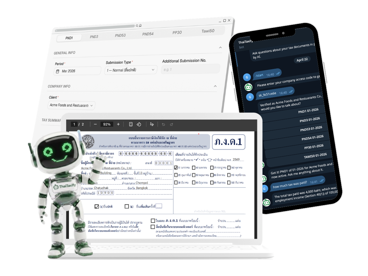 ThaiTaxify generates your PND, PP30, and Tawi50 forms in seconds, keeps every document organized by client and period, and lets your clients ask questions about them in Messenger or Telegram — any time, in Thai or English.